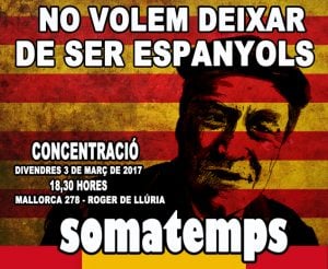 Este viernes, 3 de marzo a las 18,30 h, diversas asociaciones encabezadas por “Unidos Sí”, “Somatemps”, “Convivencia Cívica Catalana” y “Movimiento Cívico 12 de Octubre” se concentrarán ante la delegación del Gobierno en Barcelona (C/. Mallorca 278, esquina C/. Roger de Llúria). El propósito es entregar un documento dirigido a la Prensa y a la Vicepresidenta del Gobierno de España, Excma. Sra. Soraya Sáenz de Santamaría.