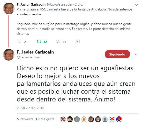 Por su parte, el presidente de la Comunión Tradicionalista, en su cuenta de Twitter, lanzó ayer mismo un breve análisis en el que, fundamentalmente, pide «que nadie se emocione», mientras que anima a luchar contra el sistema tanto desde dentro como desde fuera del mismo.