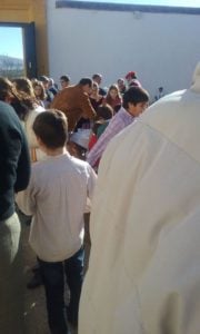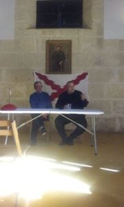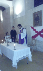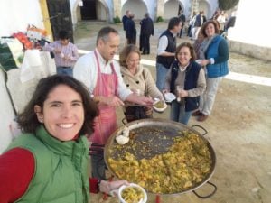 Allí se compartió por todos los asistentes unos vinos y cervezas acompañados de sabrosas tapas y a continuación se sirvió una españolísima paella cocinada por nuestro correligionario valenciano Enrique Izquierdo. Y por último, para cerrar la jornada, cuando el frío se hacía presente entre los asistentes se celebró la Santa Misa. Después, los más valientes se refugiaron en el caserío y continuaron la fiesta con canciones varias, hasta que el cuerpo aguantó.