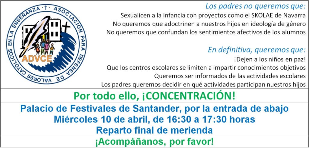 Si eres de Santander y de los que no acepta el adoctrinamiento escolar, la ideología de género, la educación sexual basada en la búsqueda exclusiva de placer sin compromiso, el ninguneo a los padres, etc., etc., te esperamos esa tarde del miércoles. No nos podemos quedar en casa, el legislador ha de ver una oposición fuerte a estas locuras educativas. No podemos limitarnos a lamentarnos desde el sillón de nuestras casas, hay que movilizarse.