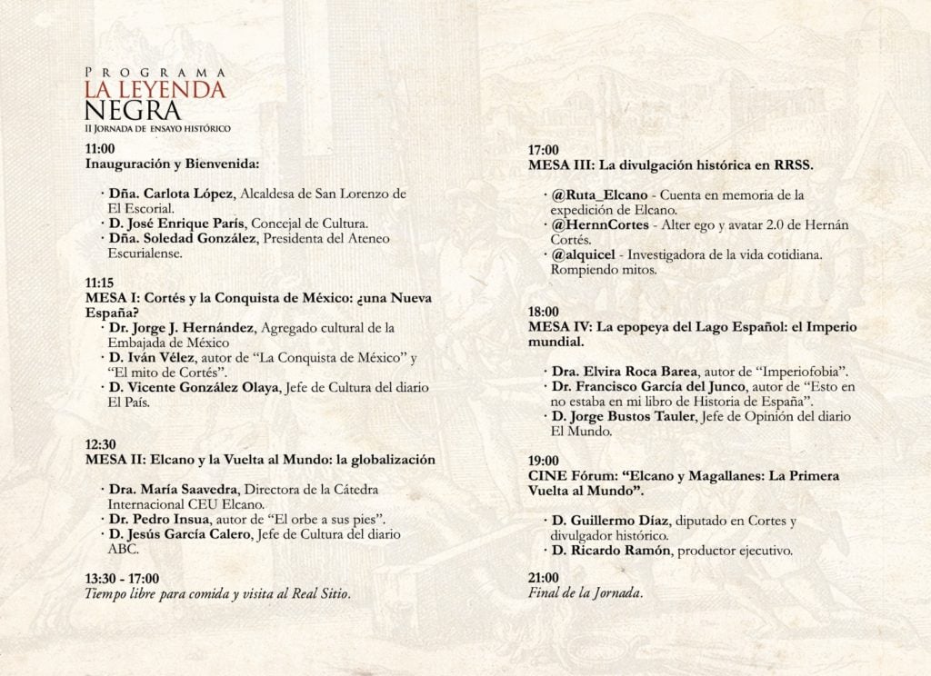 El próximo sábado 28 de septiembre va a celebrarse la segunda edición de la Jornada de Ensayo Histórico sobre la Leyenda Negra, organizada por el Ateneo Escurialense y este año centrada en la doble celebración de los quintos centenarios de la conquista de México y de la primera circunnavegación.
