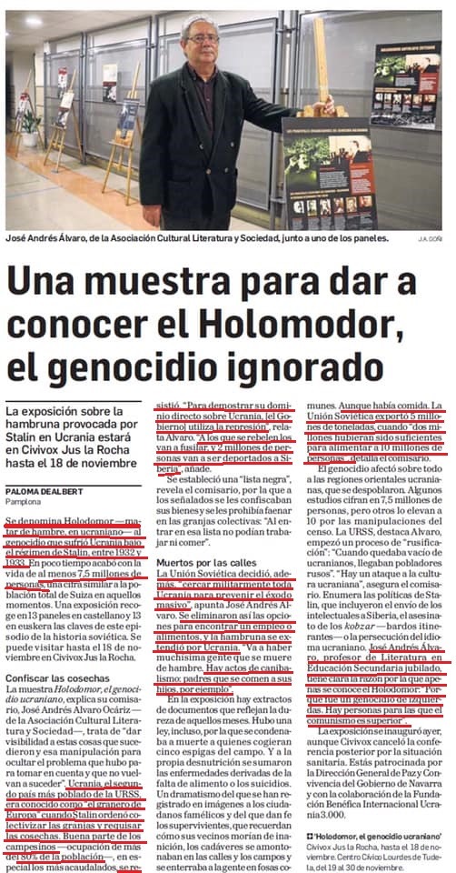 Este genocidio tuvo lugar entre 1932 y 1933. Este mes se ha llevado a cabo una interesante iniciativa en un Civibox de Pamplona donde han instalado una exposición para recordar las atrocidades de aquel genocidio comunista. (hasta el 18 de noviembre, que después, y hasta el 30 de noviembre, se trasladará al Centro Cívico Lourdes de Tudela).