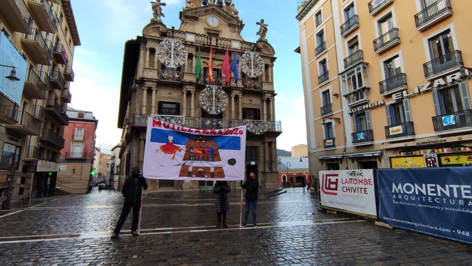 Tres representantes de la peña Mutilzarra, una moza de 67 años, un mozo de 50 y otro de 19 en representación de todos los socios, extendieron por última vez la pancarta sanferminera de 2020 como despedida de este año para olvidar. La intención era haber podido realizar una ronda con charanga antes de finalizar el año pero no ha podido ser y hemos querido ofrecer este testimonio histórico de un año sin fiestas de San Fermín en el que la peña Mutilzarra ha sido la única que ha sacado a la calle su pancarta, tanto el día de San Fermín como en esta ocasión. En el año 2020 la peña Mutilzarra ha estado en la calle dando testimonio y procurando transmitir esperanza.