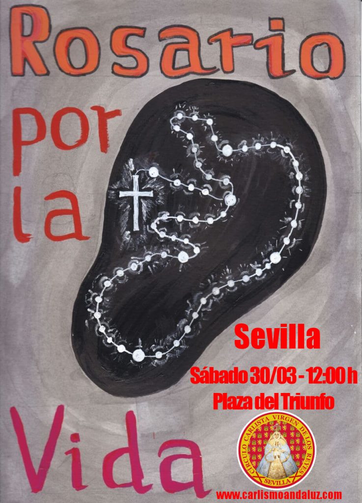 Como ya viene siendo costumbre, el próximo sábado 30 de marzo el Círculo Carlista Virgen de los Reyes convoca al rezo del Santo Rosario por la Vida en la Plaza del Triunfo, Sevilla.
