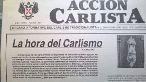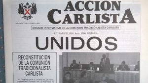 1.“Acción Carlista”. Hablemos del boletín “Acción Carlista” inmediato a la unidad. Para preparar el Congreso de la unidad se editó un número monográfico de “Acción Carlista” de gran formato (2º Tr. 1986), con el título “La ahora del Carlismo”. El siguiente número, una vez efectuada la unión de todos, fue sobre el mismo Congreso y se iniciaba con el rótulo “Unidos”.