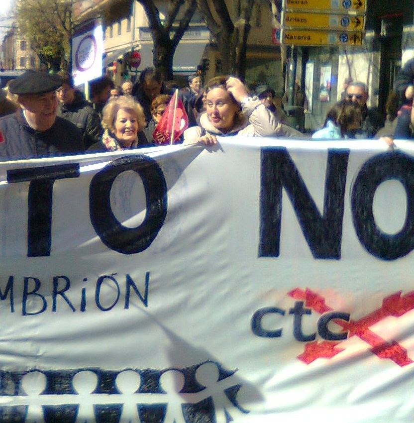 Mujer responsable y activa ante los grandes problemas sociales y políticos, en la manifestación «por la Vida, aborto NO» del 7 de marzo de 2014, junto a su esposo Miguel Ángel. En la imagen sostiene la misma pancarta que durante años ha sostenido enfrente del Parlamento de Navarra el último día -ahora el día 25- de cada mes: «Aborto No. Dios ama al embrión. CTC»