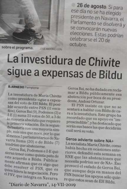 Que en la elecciones por venir, los votantes del PSN sepan bien a quiénes han votado. No han votado a los defensores del pobre, del trabajador, del parado (pues todos lo somos), sino a una oligarquía convertida en partido (como los demás) que quiere extender la mayor inmoralidad en nuestra sociedad y sólo se justifica como medio para alcanzar y mantener el poder. Lo decimos para que recapaciten y no lo hagan de nuevo. Si quieren, absténganse los muchos del PSN que no quieren el pacto de la Chivite con los separatistas, como lo hacen otros de la derecha sociológica que no votan a gente que mantiene el aborto. Y eso salvo que EH Bildu se abstenga en la investidura, aún sin recibir directamente nada a cambio, que ya lo recibirá a través de Geroa Bai, tan amigo de EH Bildu (que no condena el terrorismo).