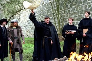 En cuanto a lo de rebelde, la película nos lo presenta como un hombre adelantado a su tiempo, paseando por el aula de Teología entre sus alumnos como un abogado de película americana entre los miembros del jurado («Señores del jurado, vean a mi cliente: ¿cómo puede ser un asesino con esa cara de bueno? Las circunstancias lo eximen de su pecado»), o bien como el Tom Berenger de El sustituto (Robert Mandel, 1996), es decir, repartiendo estopa (dialéctica) a los oyentes malotes. Sin embargo, lo cierto es que sus clases no se caracterizaban por la hondura de su razonamiento, sino por el más tenaz de los adoctrinamientos, ya que divulgaba sus propias ideas respecto de la Escritura sin atender a lo que anteriormente habían dicho los maestros sobre ella (autorizaba y desautorizaba libros bíblicos al albur de su apetencia); además, repartía entre sus adeptos los panfletos que había elaborado con Cranach el Viejo, en los que arremetía sin rubor alguno contra el papa y contra la Casa de Habsburgo, que reinaba en ese momento sobre Alemania y sobre la mayor parte de Europa. Por otro lado, debemos indicar que esta rebeldía de pitiminí fue más bien el producto de una rabieta que la consecuencia de su pretendida genialidad (¿recuerda el lector lo que afirmábamos de su soberbia?), ya que, cuando el sumo pontífice lo llamó al orden, uso contra él las mismas vejaciones que había usado… ¡contra los que se habían opuesto a la doctrina del sumo pontífice! En cuanto a la doctrina de las indulgencias, que supuestamente originó este cisma dentro de la Iglesia, y que era una manera fácil de enriquecerse, sorprende que Lutero nunca se manifestara en contra del dineral que recibía a espuertas del príncipe Federico el Sabio (en la película, el gran Peter Ustinov), que no solo patrocinaba cada uno de sus exabruptos contra aquella, sino que también financiaba sus clases en la universidad que él mismo había fundado, y en la que, como hemos visto, se vituperaba una y otra vez la figura del papado (por cierto, si el príncipe Federico prohibió la predicación de las indulgencias en Sajonia fue para impedir el enriquecimiento de su rival, Alberto de Brandeburgo, y no por rebeldía contra la Iglesia, como postula el film).