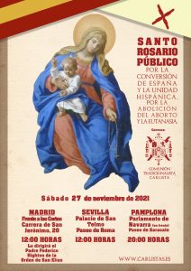 2 comentarios en “La Comunión Tradicionalista Carlista convoca, para el sábado 27 de noviembre, un rosario público en Madrid, Sevilla y Pamplona”