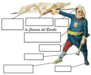 Lo recuadros de “la caverna del escriba” son para relleno de críos: bandera religioso-política, tea incendiaria, boina al completo, escapulario de la Virgen del Carmen, cartuchera para munición, trabuco de 1800, alpargata de aldeano y zapato de cura. Faltaría la etiqueta de cara de mala leche. A ello se le añade lo tendencioso del título y la narrativa del texto que omito.  Llama la atención que en este libro tan elegante, son raras las imágenes de este mal gusto.