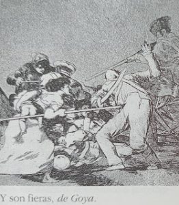 Fijémonos en el segundo plano del grabado, que es una matanza algo similar a la dibujada por Goya y que pocas páginas antes recoge el libro. Además, dice la leyenda: