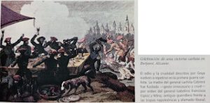 «Celebración de una victoria carlista en Burjasot. Alicante.  El odio y la crueldad descritos por Goya vuelven a repetirse en la primea guerra carlista. La madre del general carlista Cabrera fue fusilada -gesto innecesario y cruel- por orden del general isabelino Francisco Espoz y Mina, antiguo guerrillero frente a las tropas napoleónicas y afamado liberal» (p. 125)»