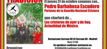 El Grupo de Propaganda de Madrid de la Comunión Tradicionalista Carlista (CTC) ha organizado una cena, para el 31 de octubre, con el portavoz de la Guardia Nacional Cristera de México.
